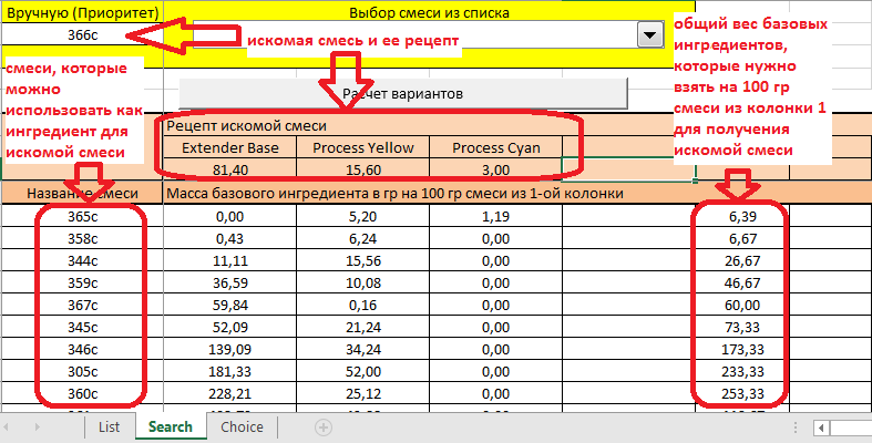 2) Вы можете использовать любую из смесей, которые программа выдала в качестве возможного варианта. Не обязательно ту, которая стоит выше в табличке результатов (т.е. с наименьшей массовой долей базовых ингредиентов). Вы можете подойти индивидуально к вопросу, какую смесь взять в качестве ингредиента в каждом конкретном случае.