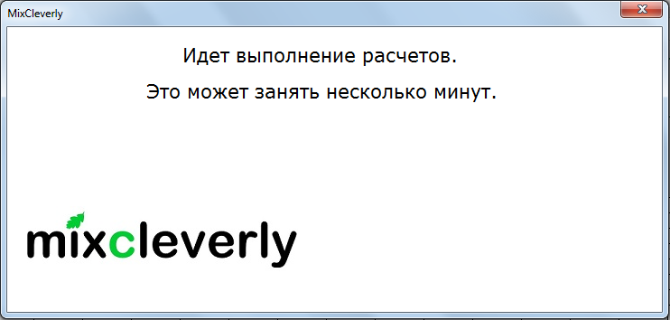 3.3. Программа может вести расчеты достаточно долго (несколько минут), если количество ингредиентов, входящих в состав смеси велико (4 и более), а количество других смесей из каталога, которые могут быть использованы, как ингредиент для искомого рецепта больше 15-20. В процессе расчетов вы будете видеть информационное окно о том, что расчеты идут. См. ниже.
